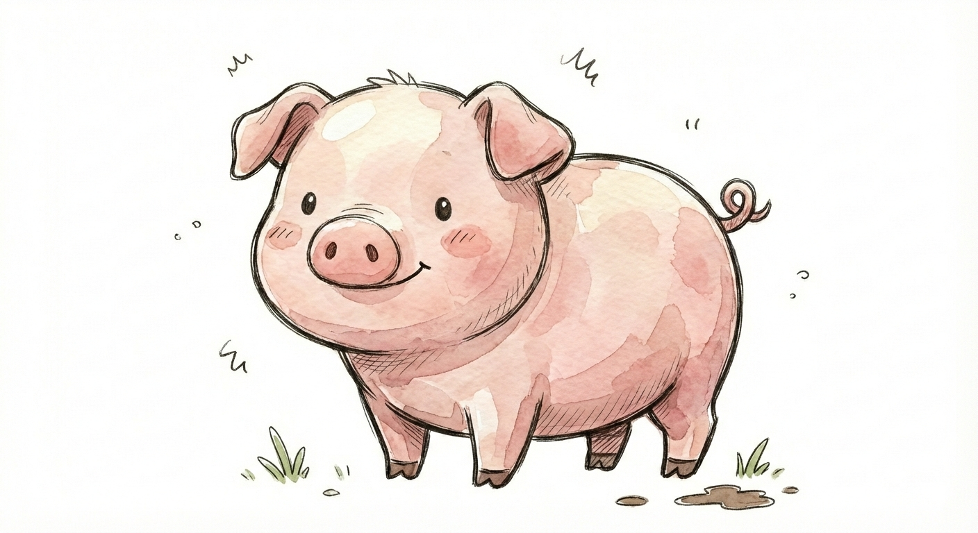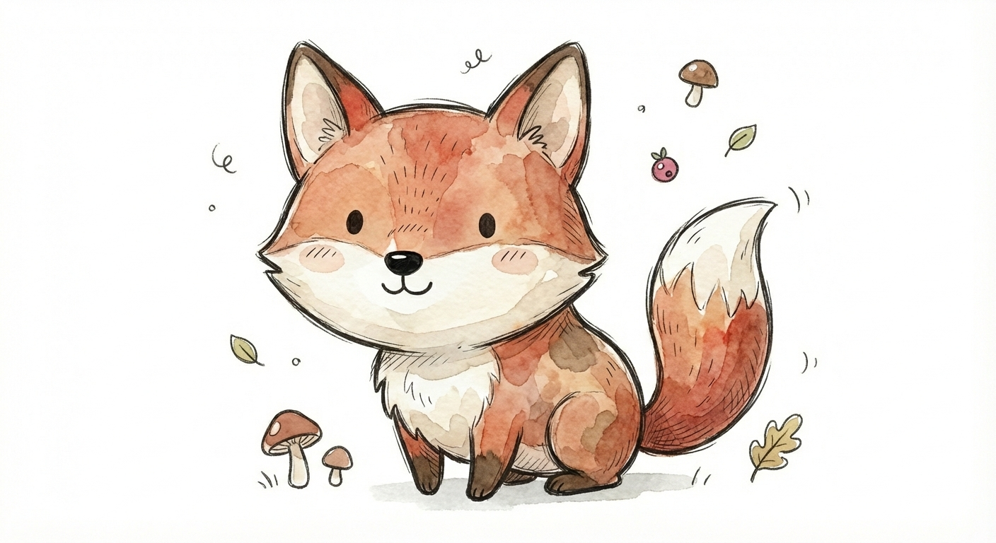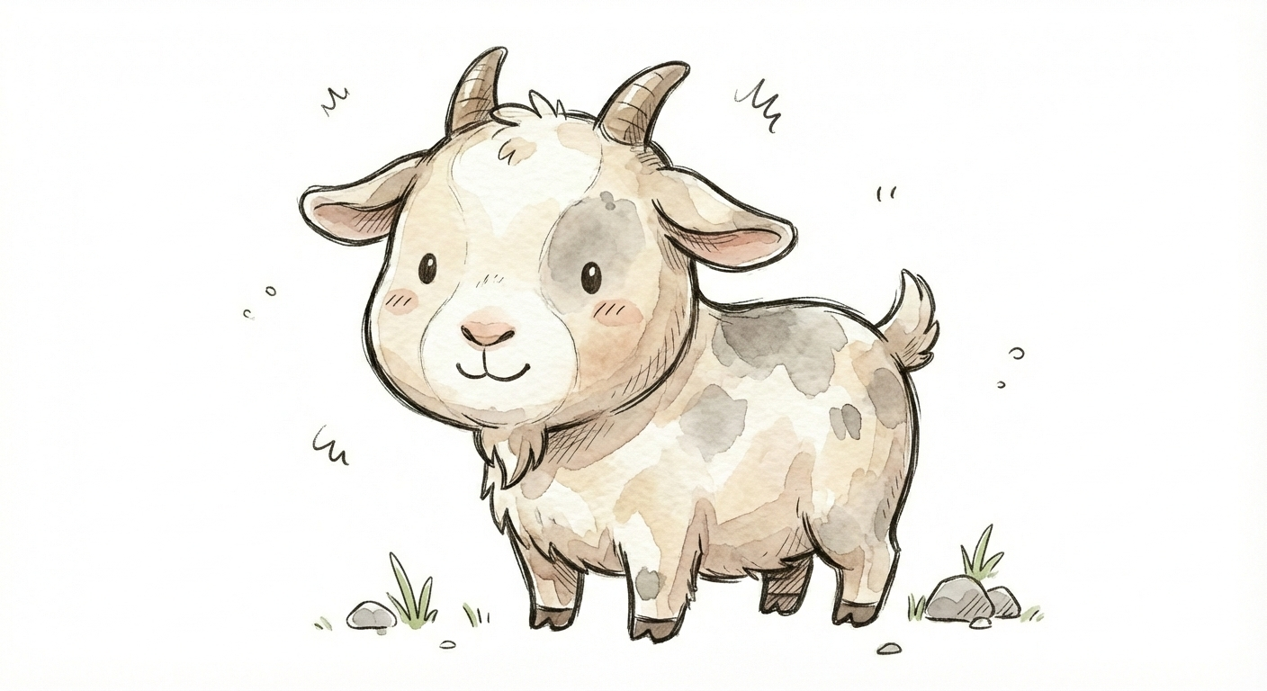 Niedliches, kindgerecht illustriertes Tier als einzelne, zentrierte Figur vor weißem Hintergrund, im frech-nordischen Aquarell-Skizzenstil. Klare, leicht wackelige Tuschekonturen, sichtbare Pinsel- und Strichtextur, dezente Schraffuren im Fell, weiche handgemalte Farbflächen in gedeckten Farben. Runde, einfache Formen, leicht überproportionaler Kopf, kleiner kompakter Körper, minimalistische Gesichtszüge mit zwei Punktaugen und kleinem Lächeln. Keine harten Schatten, sondern sanfte, transparente Aquarellschichten. Leicht raue, handgezeichnete Linien statt glatter Vektorkanten. Subtile, vereinzelte Kritzelpunkte oder kleine Details im Hintergrund, aber keine echte Szene. Figur steht oder schwebt mittig. Insgesamt charmant, humorvoll, warm und handgemacht wirkend, wie eine moderne Kinderbuchillustration auf weißem Hintergrund.