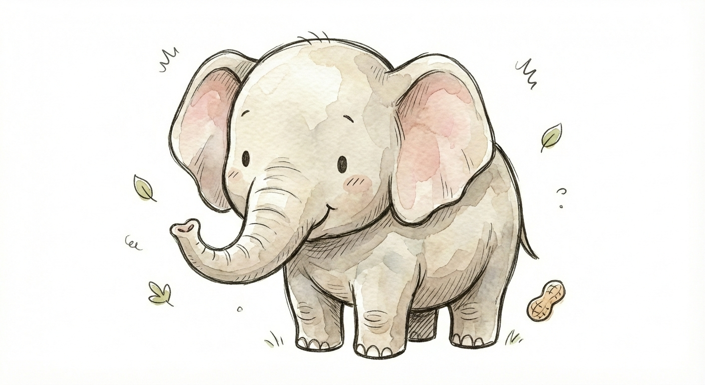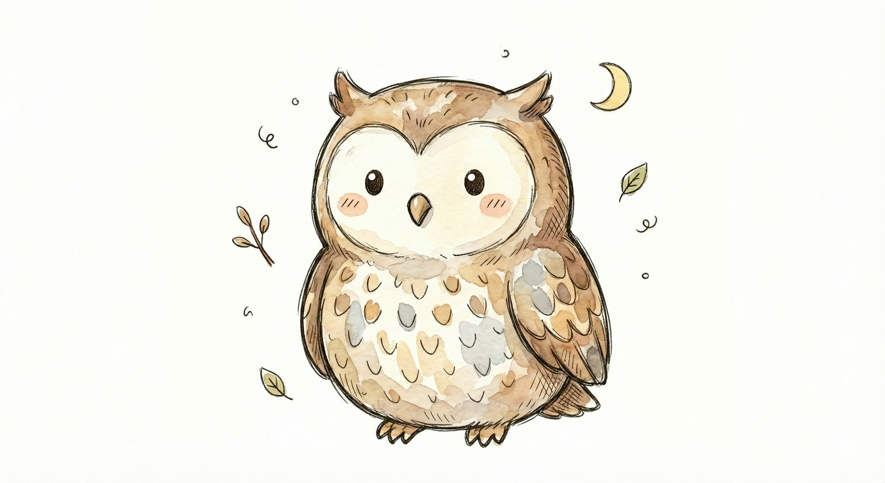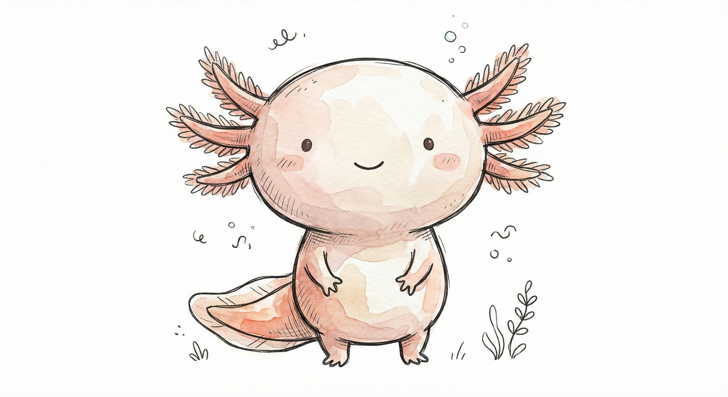Niedliches, kindgerecht illustriertes Tier als einzelne, zentrierte Figur vor weißem Hintergrund, im frech-nordischen Aquarell-Skizzenstil. Klare, leicht wackelige Tuschekonturen, sichtbare Pinsel- und Strichtextur, dezente Schraffuren im Fell, weiche handgemalte Farbflächen in gedeckten Farben. Runde, einfache Formen, leicht überproportionaler Kopf, kleiner kompakter Körper, minimalistische Gesichtszüge mit zwei Punktaugen und kleinem Lächeln. Keine harten Schatten, sondern sanfte, transparente Aquarellschichten. Leicht raue, handgezeichnete Linien statt glatter Vektorkanten. Subtile, vereinzelte Kritzelpunkte oder kleine Details im Hintergrund, aber keine echte Szene. Figur steht oder schwebt mittig. Insgesamt charmant, humorvoll, warm und handgemacht wirkend, wie eine moderne Kinderbuchillustration auf weißem Hintergrund.
