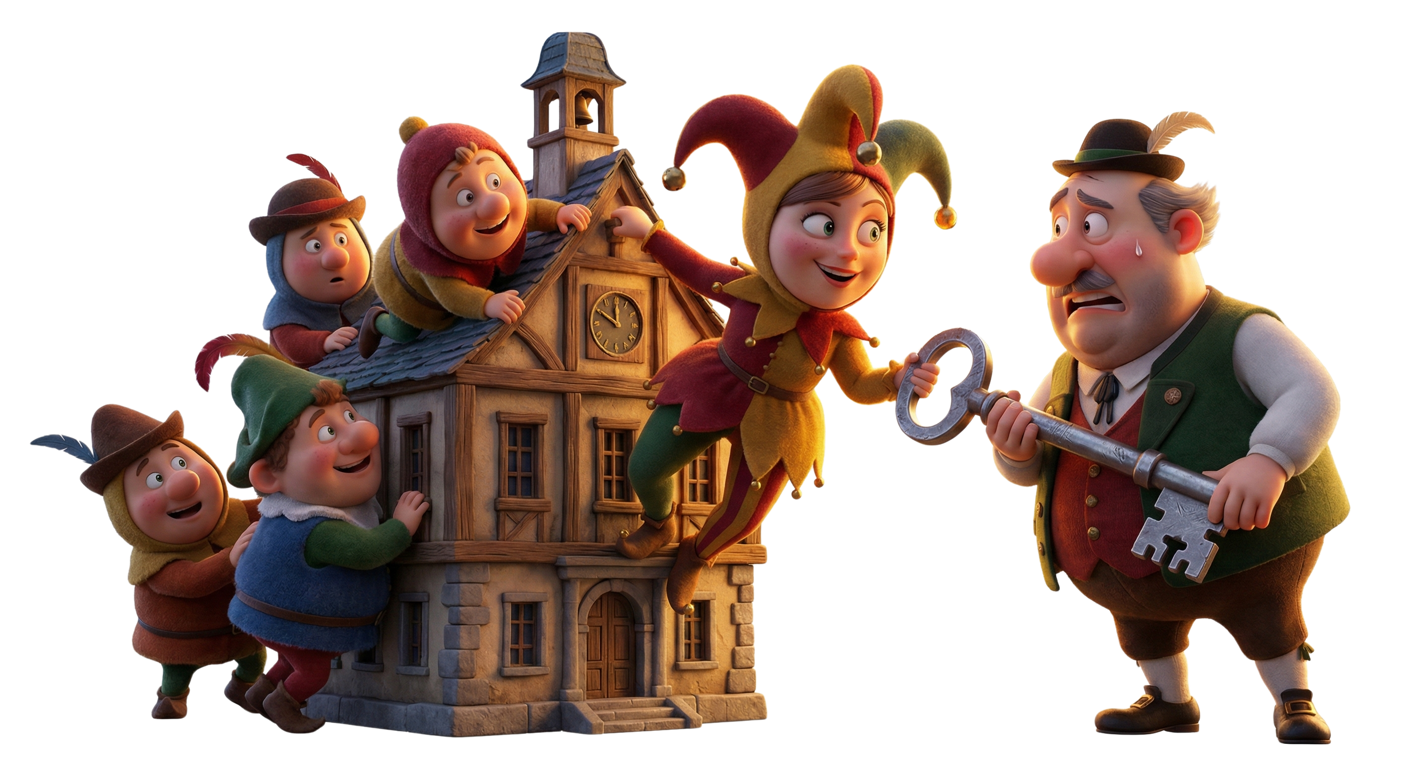 Es handelt sich eindeutig um einen 3D-CGI-Animationsstil (Computer Generated Imagery). Der Look entspricht hochwertigen, modernen Animationsfilmen. Es ist keine 2D-Zeichnung, kein Ölgemälde und keine klassische Buchillustration. Material & Texture: Tactile textures are visible: fuzz on fabric, scratches on metal, wood grain, slight imperfections. Subsurface scattering on skin (soft, translucent wax-like look). Detailed hair strands clumped in stylized shapes. Background:Isolated on a pure white background (Hex #FFFFFF). No floor shadow, no background environment. The character is cut out against clean white, but retains the dramatic internal lighting. Technical: 8k resolution, octane render, raytracing, unreal engine 5, hyper-detailed.