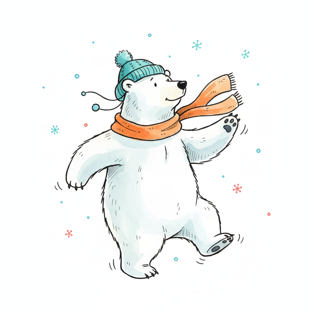 Ein süßer Eisbär mit blauer Mütze und orangefarbenem Schal tanzt fröhlich im Schneefall.