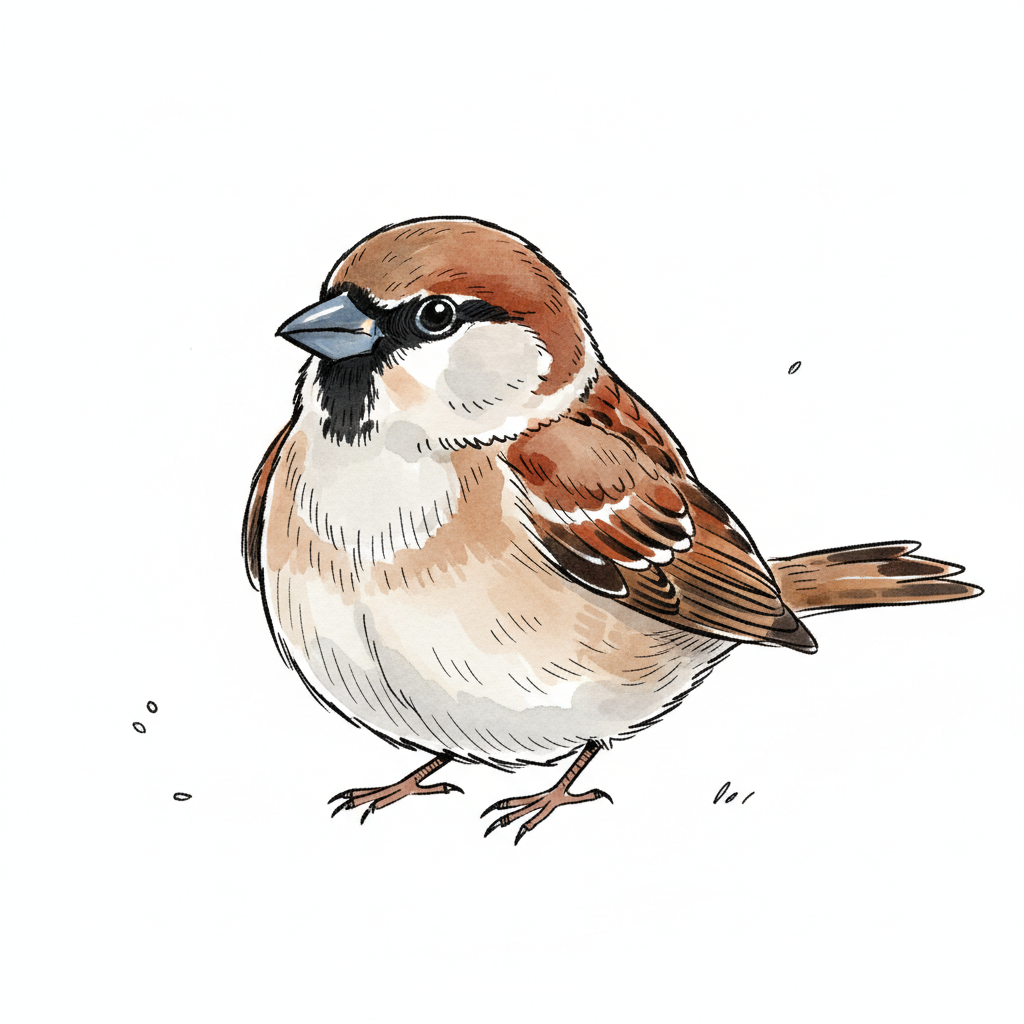 Niedliche Illustration eines Spatzen mit braunem Gefieder auf weißem Hintergrund.