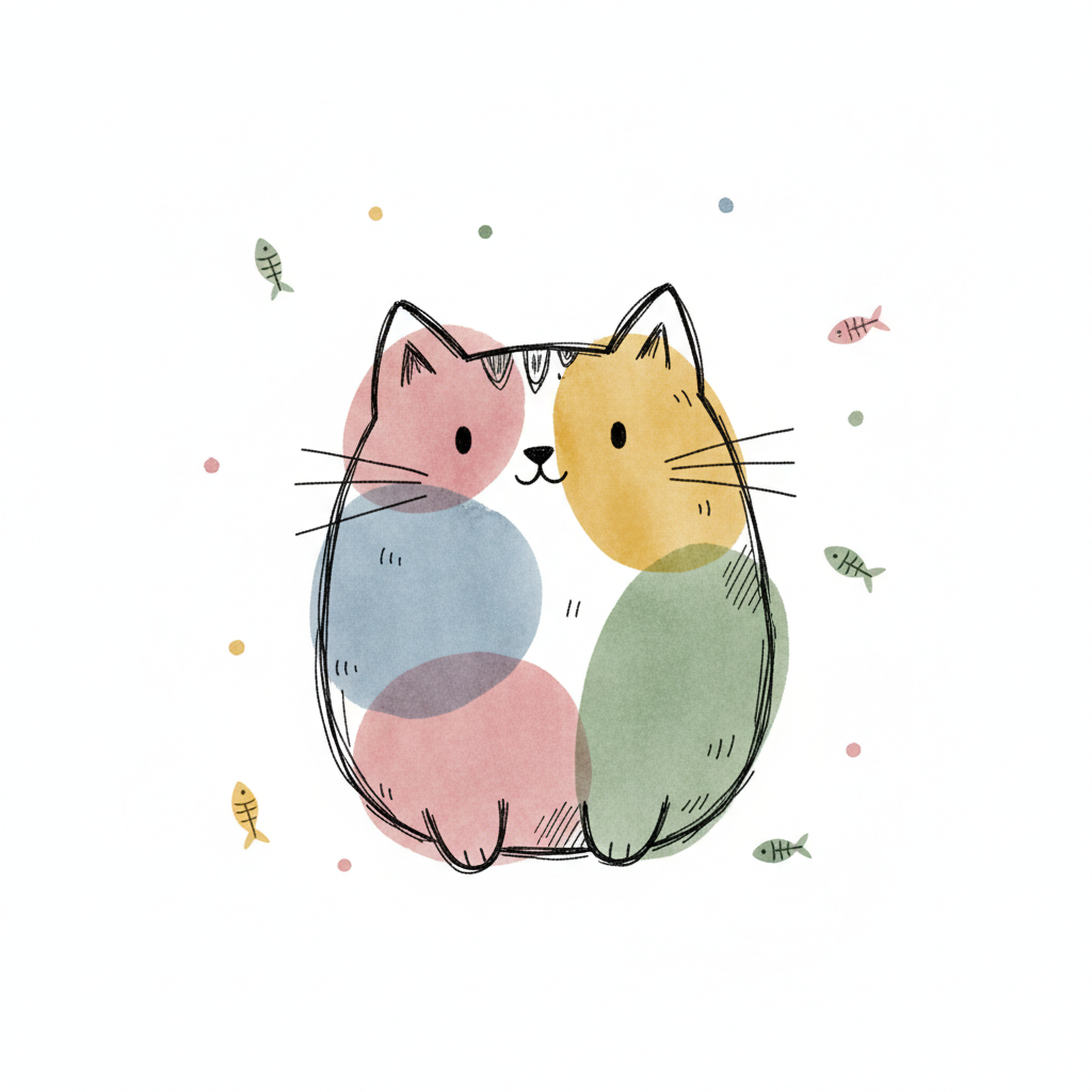 Niedliche, bunte Katze im Aquarell-Stil mit schwarzer Umrandung, umgeben von kleinen Fischen.
