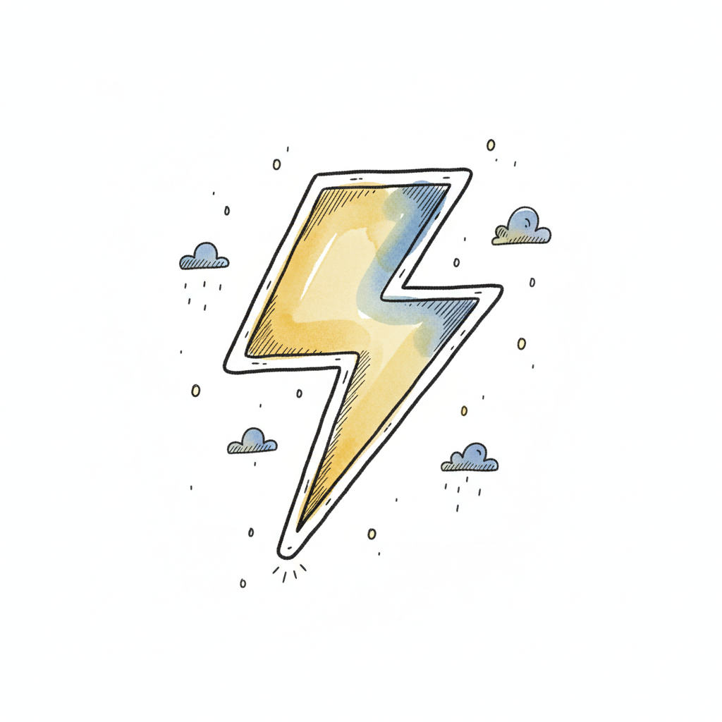 Bunte Blitzgrafik umgeben von Wolken mit Regeneffekten.