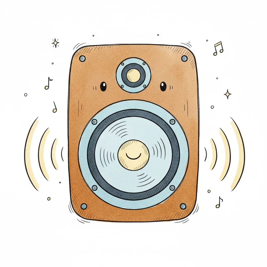 Grafik eines Lautsprechers mit musikalischen Noten und freundlichem Gesicht.