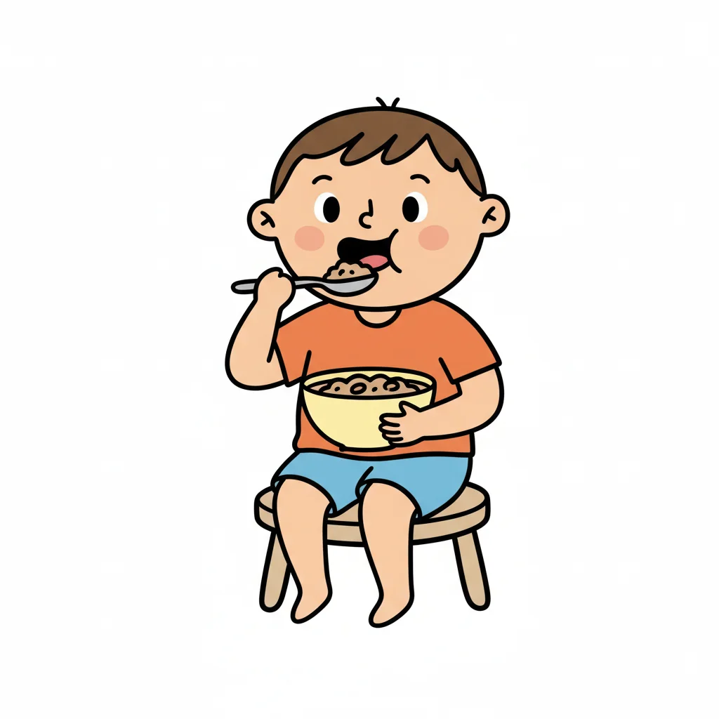 Ein Junge sitzt und isst mit einem Löffel aus einer Schüssel.