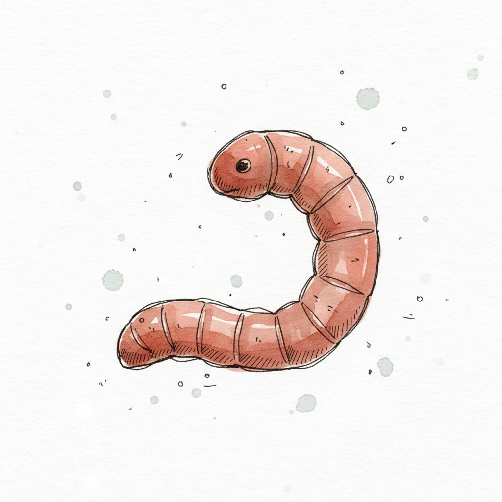 Niedliche, rosa-rote Wurm-Illustration im Cartoon-Stil auf weißem Hintergrund mit Spritzern.