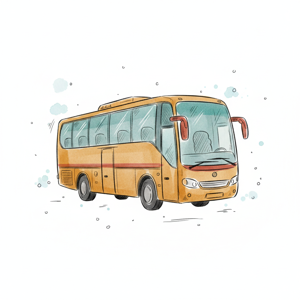 Illustration eines gelben Reisebusses im Aquarell-Stil auf weißem Hintergrund.