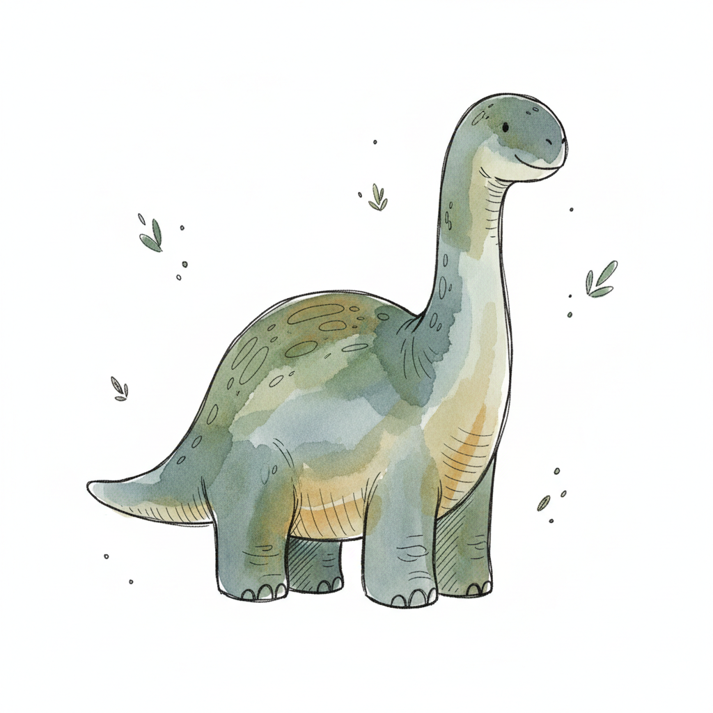 Niedliche Aquarell-Illustration eines lächelnden, langhalsigen Dinosauriers in Grün- und Brauntönen.
