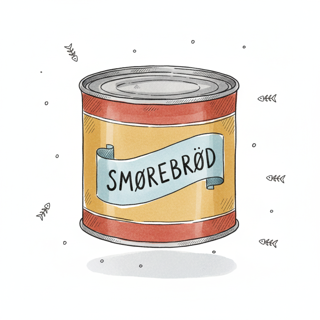 Bunte Illustration einer Dose "SMØREBRØD" umgeben von Fischgräten auf weißem Hintergrund.