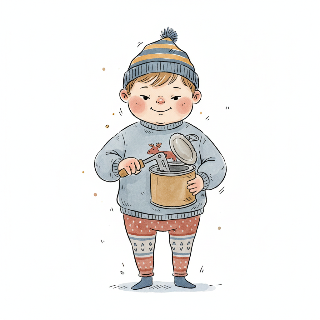 Niedliches Kind in Winterkleidung öffnet eine Dose mit einem Dosenöffner.