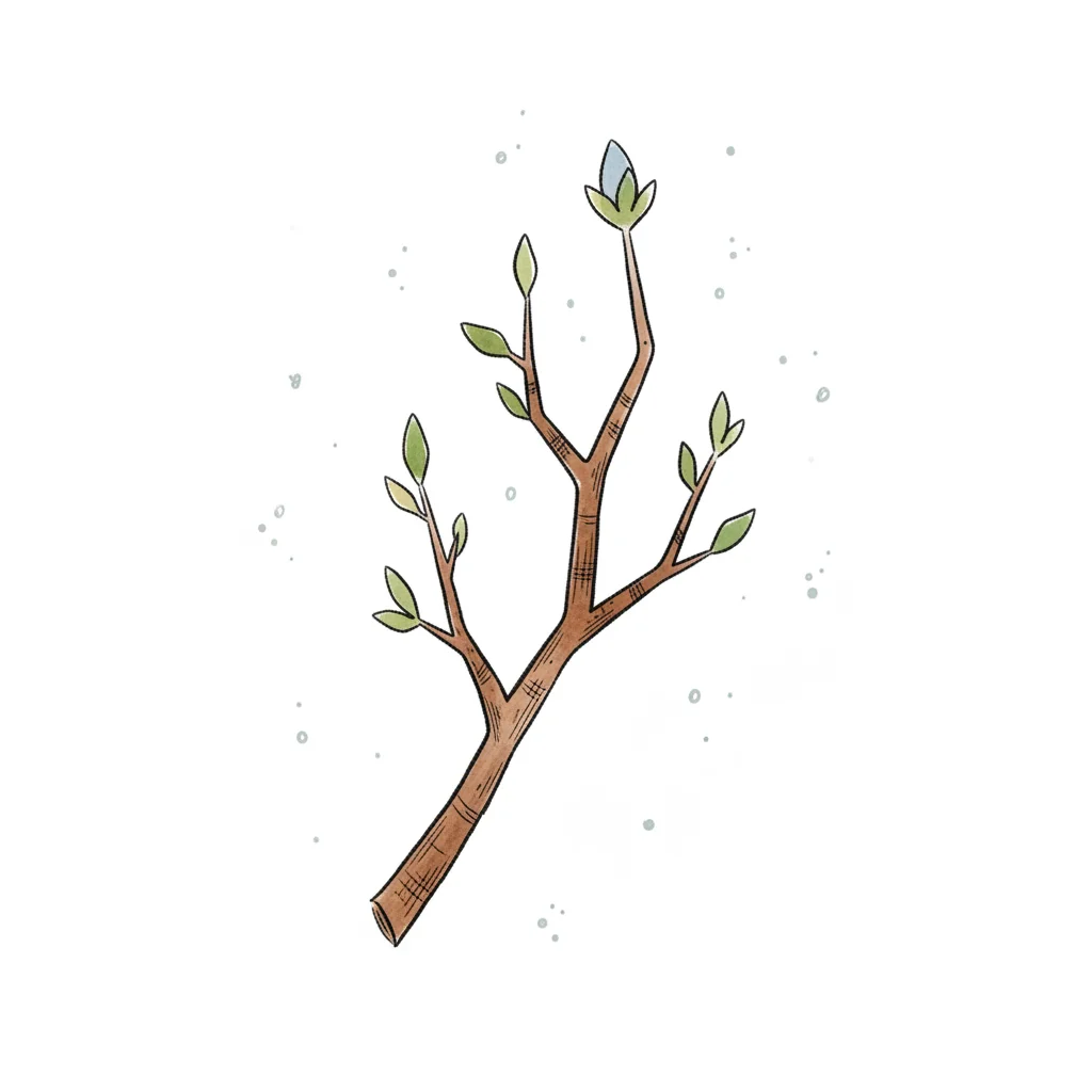 Ein dünner Ast mit frischen Blattknospen auf weißem Hintergrund.