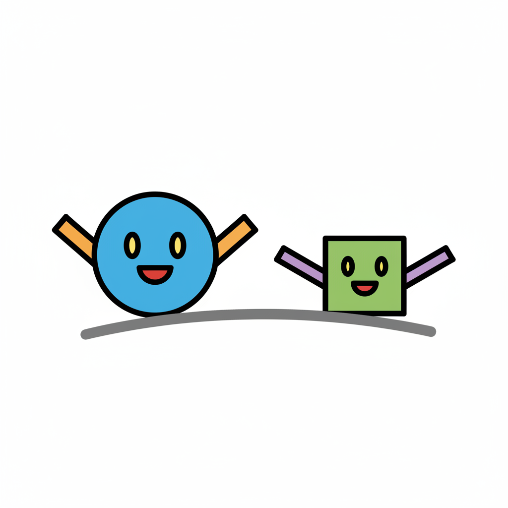 Ein lächelnder blauer Kreis und ein grünes Quadrat mit Armen stehen auf einer grauen Linie.