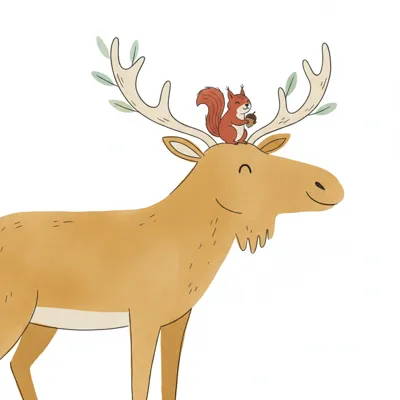 Ein lächelnder Elch trägt ein Eichhörnchen mit Eichel auf seinem Geweih. Süße Waldszene.