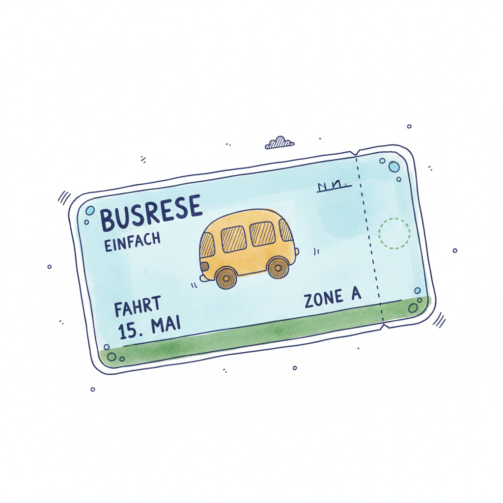 Aquarell-Zeichnung einer Busfahrkarte mit gelbem Bus, Aufschrift 'BUSRESE EINFACH', '15. MAI', 'ZONE A'.