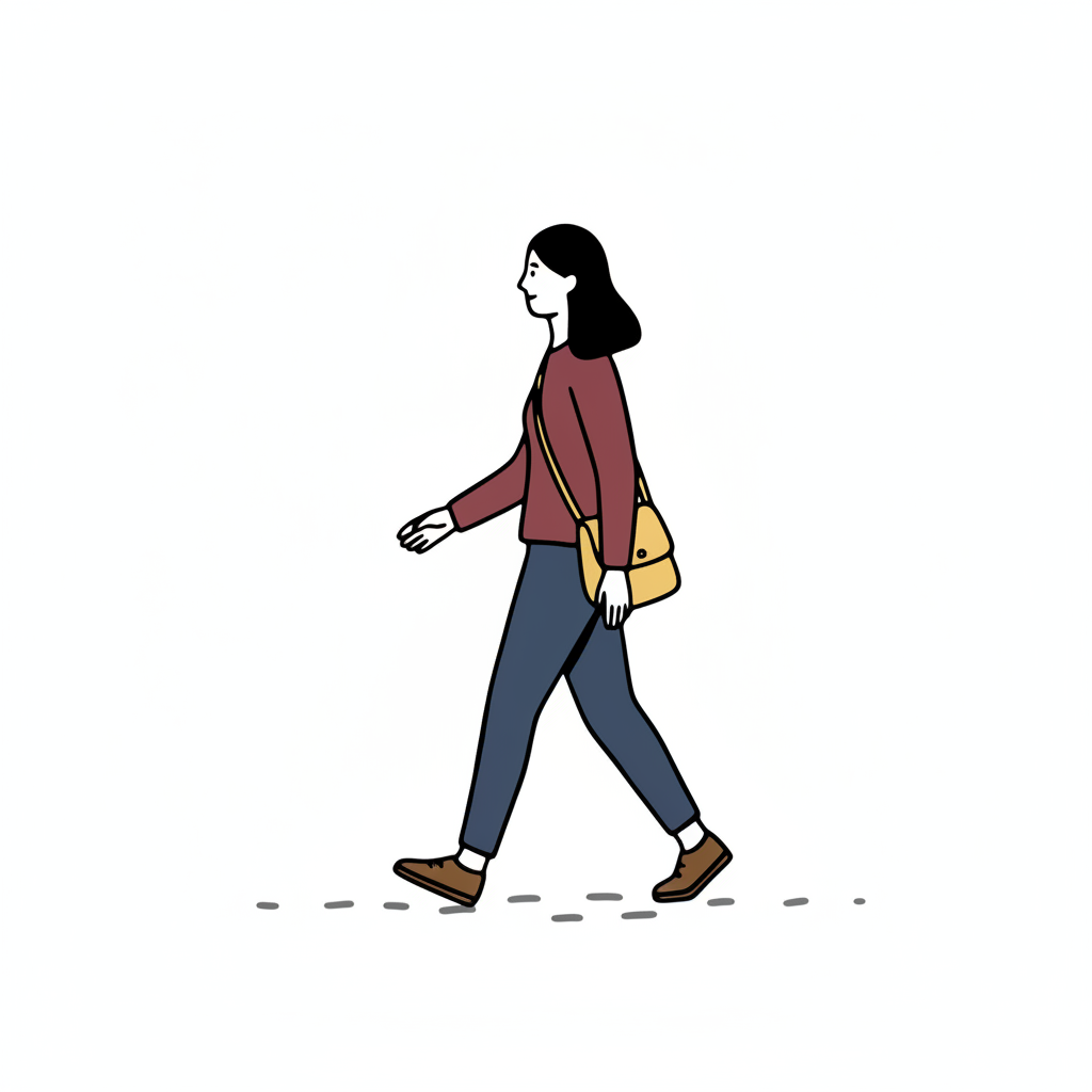 Stilisierte Zeichnung einer gehenden Frau mit dunklen Haaren, rotem Oberteil und gelber Tasche.