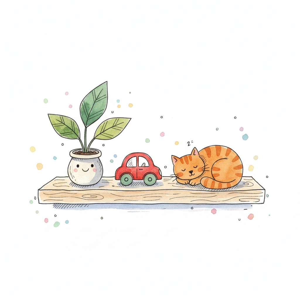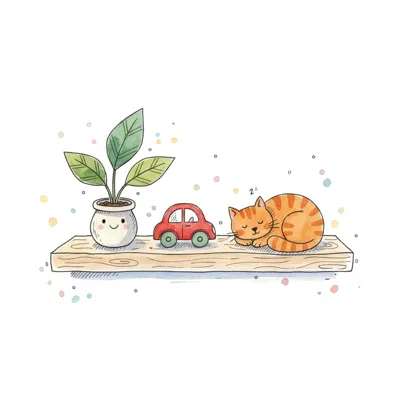 Ein stilvolles Bild mit einer Pflanze, einem Spielzeugauto und einer schlafenden Katze.