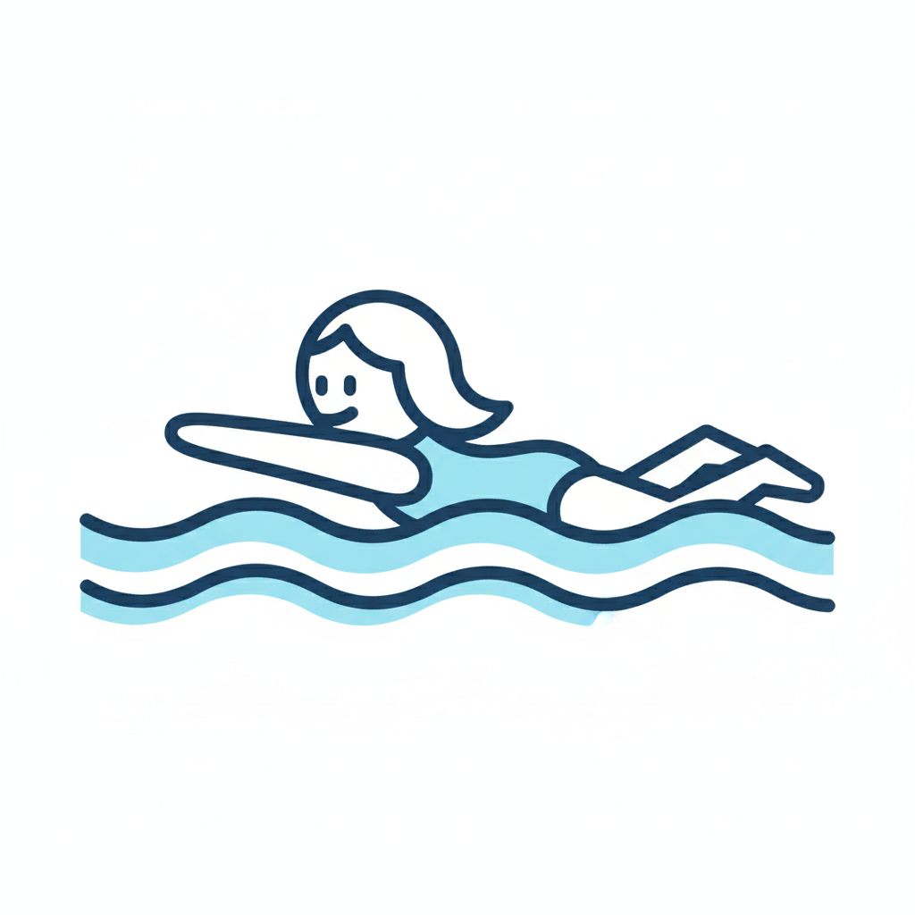 Icon einer lächelnden Frau im Badeanzug, die im Wasser schwimmt, mit blauen Wellen.