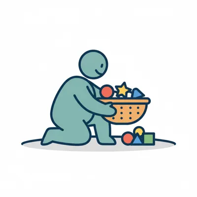 Stilisierte Figur kniet, hält Korb mit bunten Formen, einige liegen daneben.