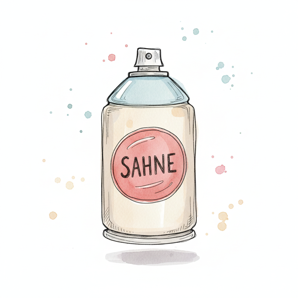 Aquarell-Illustration einer Sprühdose mit der Aufschrift 'SAHNE' und Farbspritzern im Hintergrund.