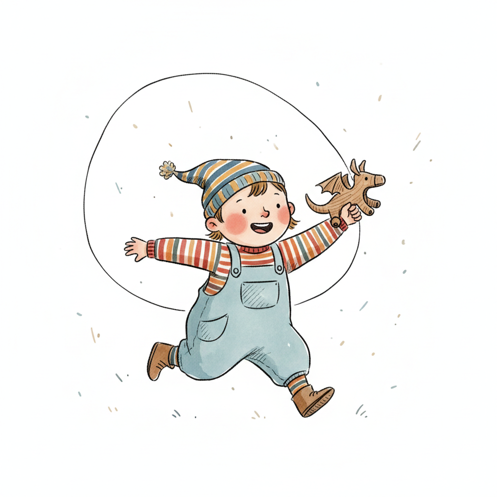 Ein fröhlicher Junge mit einem Spielzeug läuft begeistert herum.