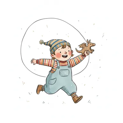 Niedliche, kindgerecht illustrierte Szene mit einem Kind oder einer Person als Hauptfigur, vor rein weißem Hintergrund, im frech-nordischen Aquarell-Skizzenstil. Klare, leicht wackelige Tuschekonturen, sichtbare Pinsel- und Strichtextur, dezente Schraffuren, weiche handgemalte Farbflächen in gedeckten Farben. Einfache, runde Formen. Keine harten Schatten, sondern sanfte, transparente Aquarellschichten. Leicht raue, handgezeichnete Linien statt glatter Vektorkanten. Subtile, vereinzelte Kritzelpunkte oder kleine Details im Hintergrund (wie Pünktchen oder feine Striche), aber keine echte Umgebung oder Landschaft. Die Figur ist mittig zentriert. Insgesamt charmant, humorvoll, warm und handgemacht wirkend. WICHTIG: Das Bild darf ABSOLUT KEINEN TEXT, KEINE BUCHSTABEN und KEINE ZAHLEN enthalten.