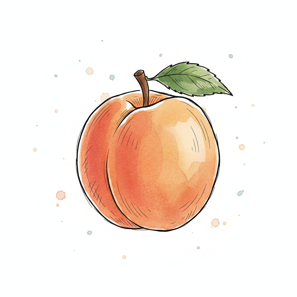 Illustration einer Pfirsichfrucht mit Stiel und Blatt im Aquarellstil auf weißem Hintergrund.