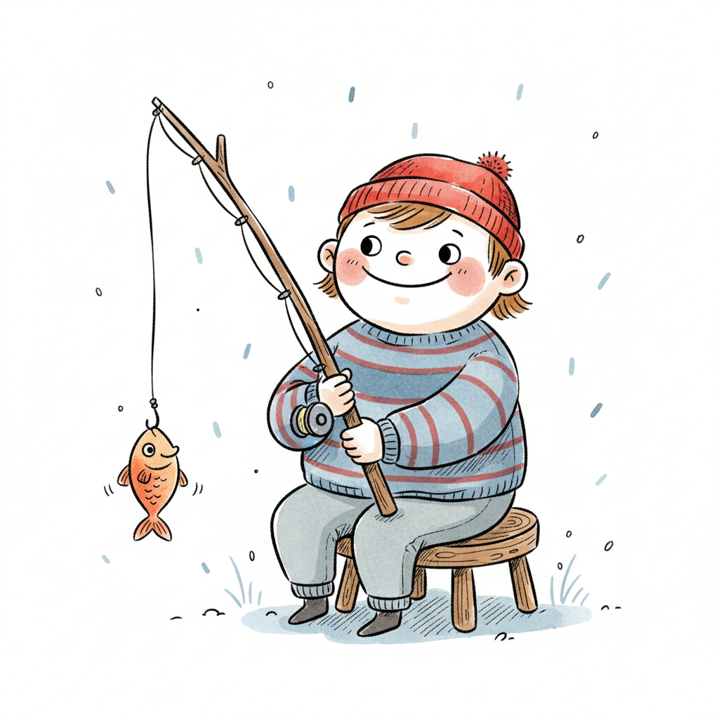 Fröhliches Kind beim Angeln, hat einen kleinen Fisch gefangen. Trägt Mütze und Pullover.