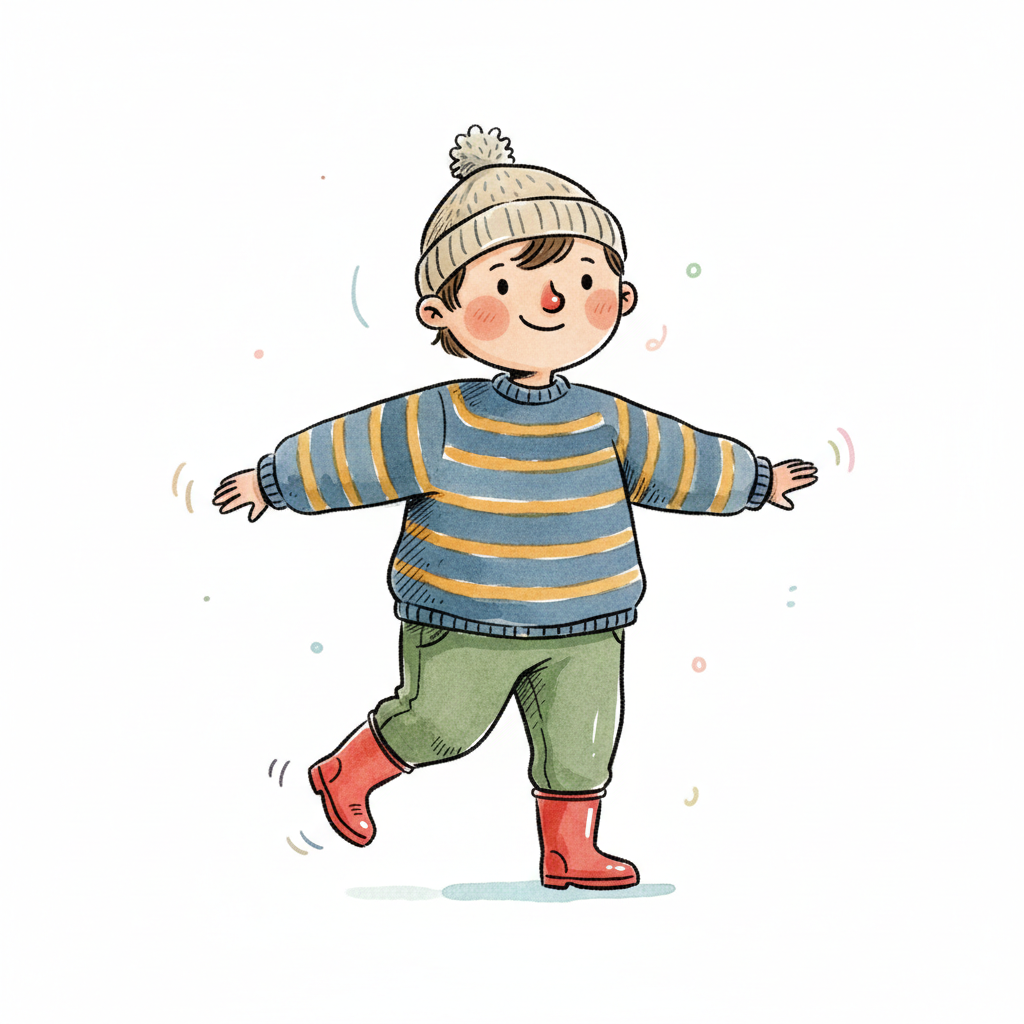 Fröhlicher Junge in Mütze, gestreiftem Pullover und roten Stiefeln balanciert spielerisch.