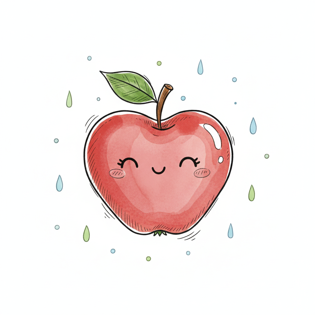 Ein fröhlicher, lächelnder Apfel mit einem Blatt und Wassertropfen.