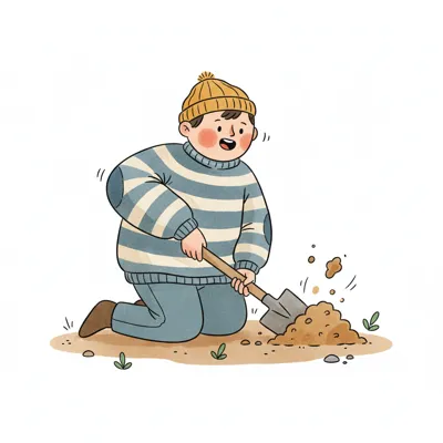 Ein Cartoon-Junge in Mütze und Pullover kniet und gräbt mit einer Schaufel in der Erde.