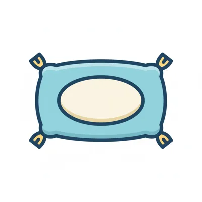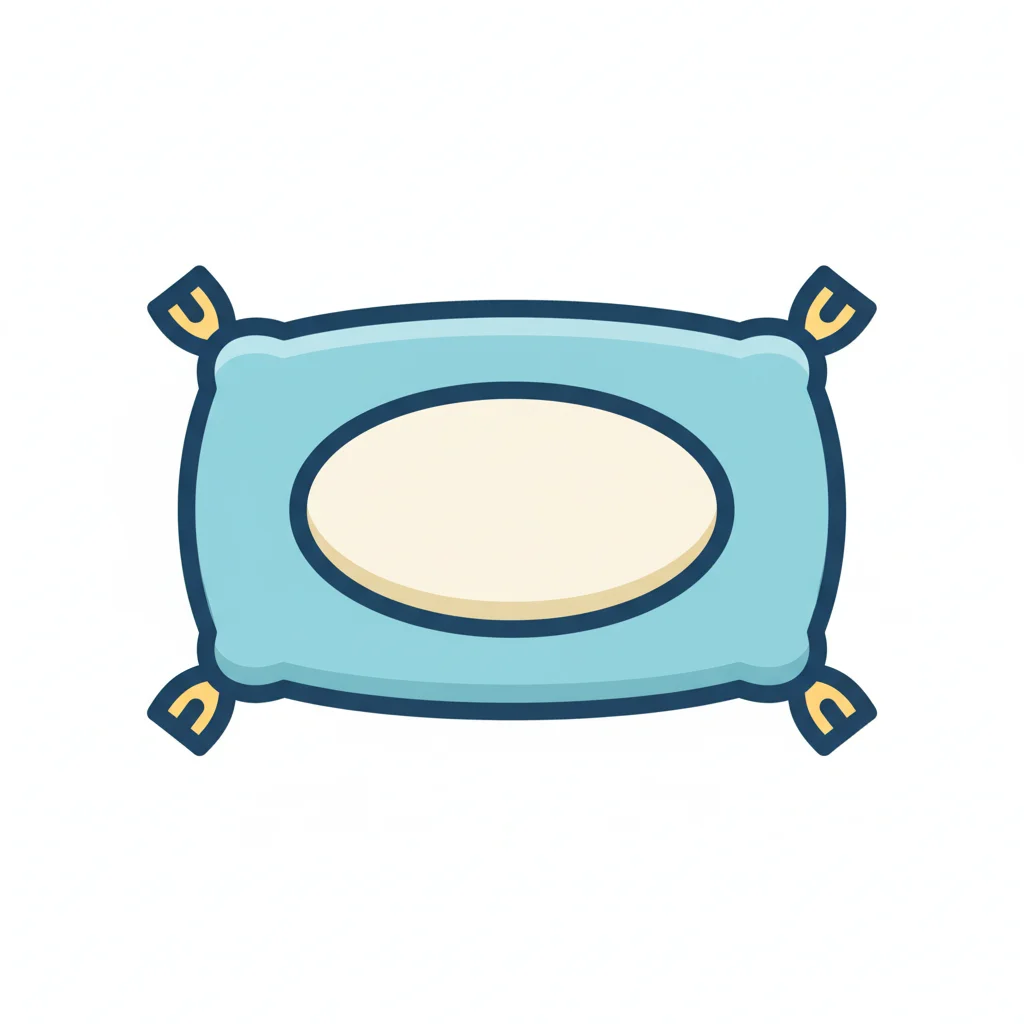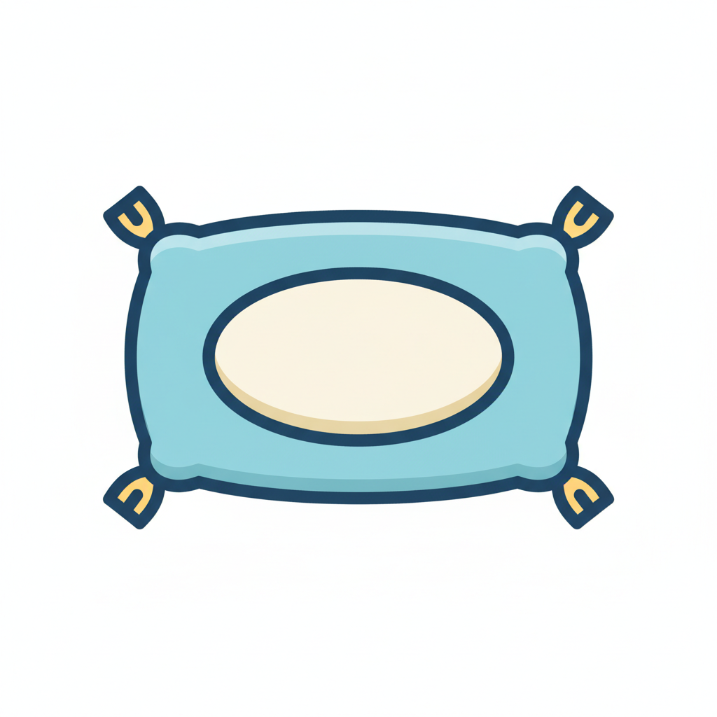 Cartoon-Illustration eines hellblauen Kissens mit cremefarbenem Oval und gebundenen Ecken.