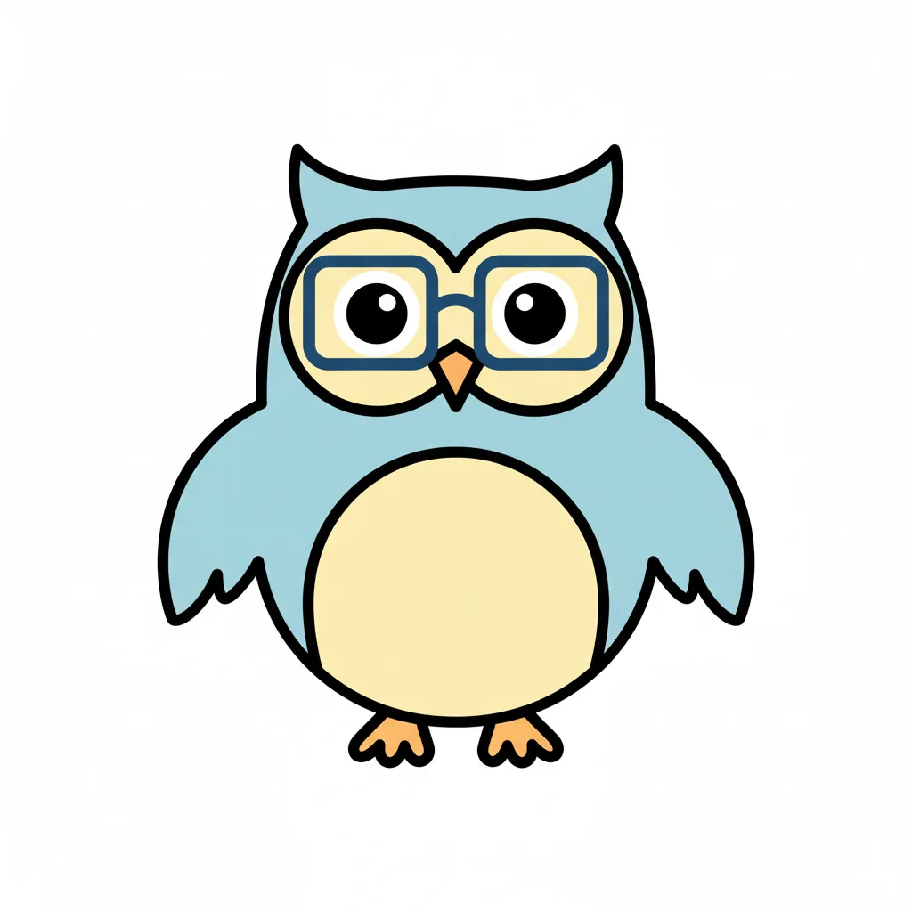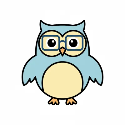 Niedliche Cartoon-Eule in Hellblau und Gelb mit Brille auf weißem Hintergrund.