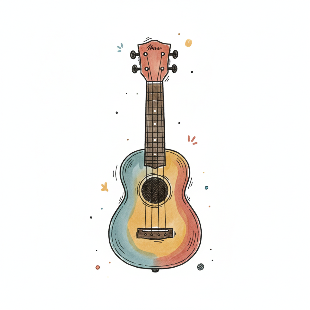 Bunte Ukulele-Illustration im Aquarellstil auf weißem Hintergrund mit kleinen Farbspritzern.