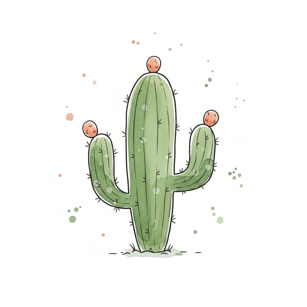 Ein lustiger Kaktus mit Gesichtern auf den Spitzen und leichten Farbklecksen.
