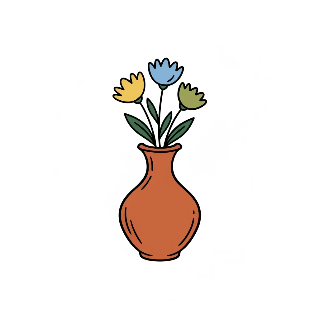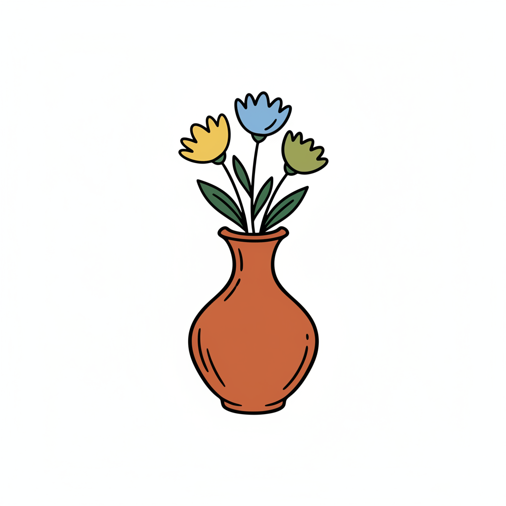 Einfache Illustration einer braunen Vase mit drei bunten Blumen (gelb, blau, grün) auf weißem Grund.