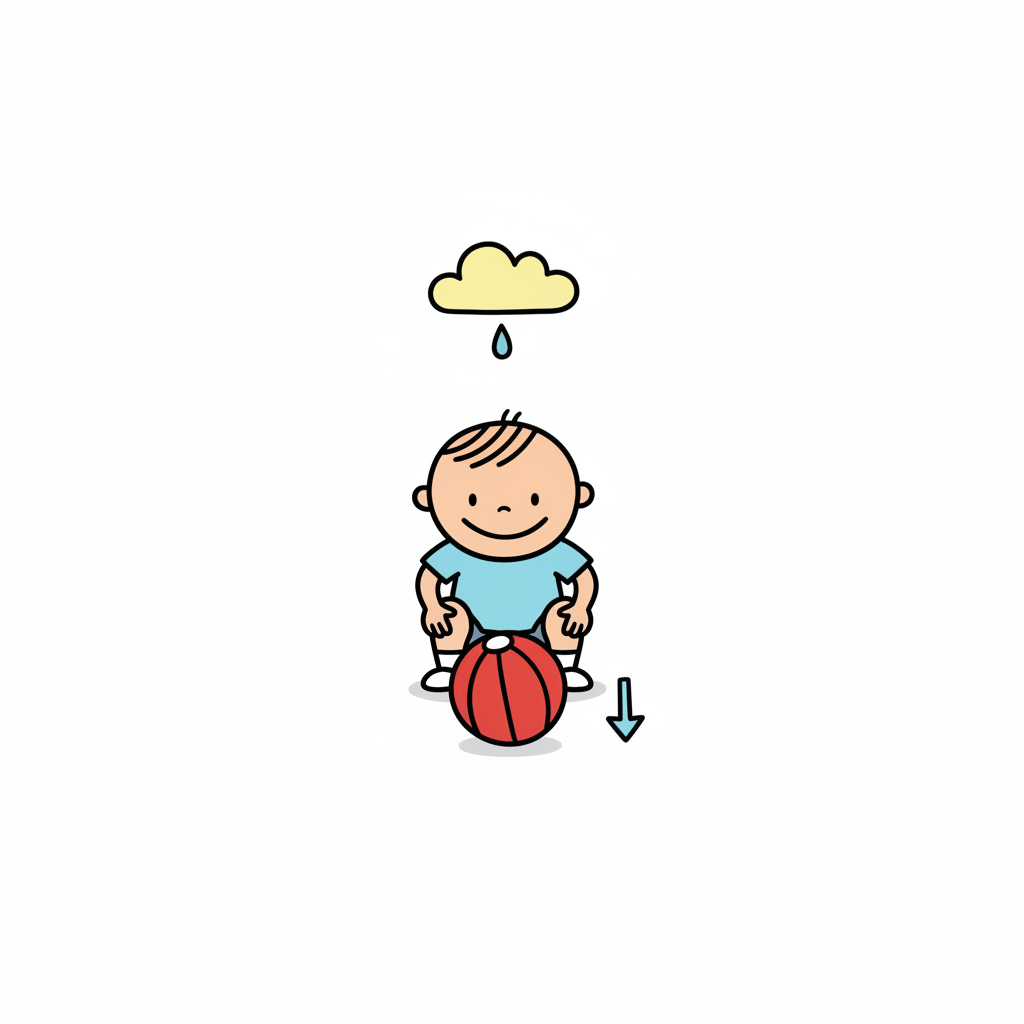 Ein lächelndes Baby hockt vor einem roten Ball. Eine Wolke tropft, ein Pfeil zeigt nach unten.