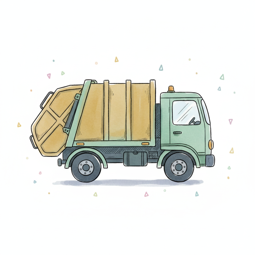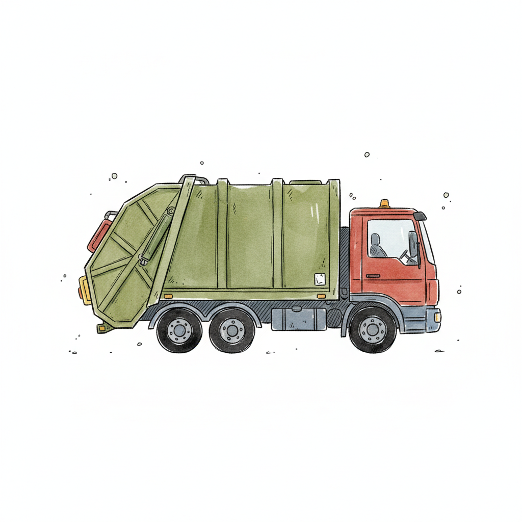Illustration eines roten und grünen Müllwagens im Aquarellstil auf weißem Hintergrund.
