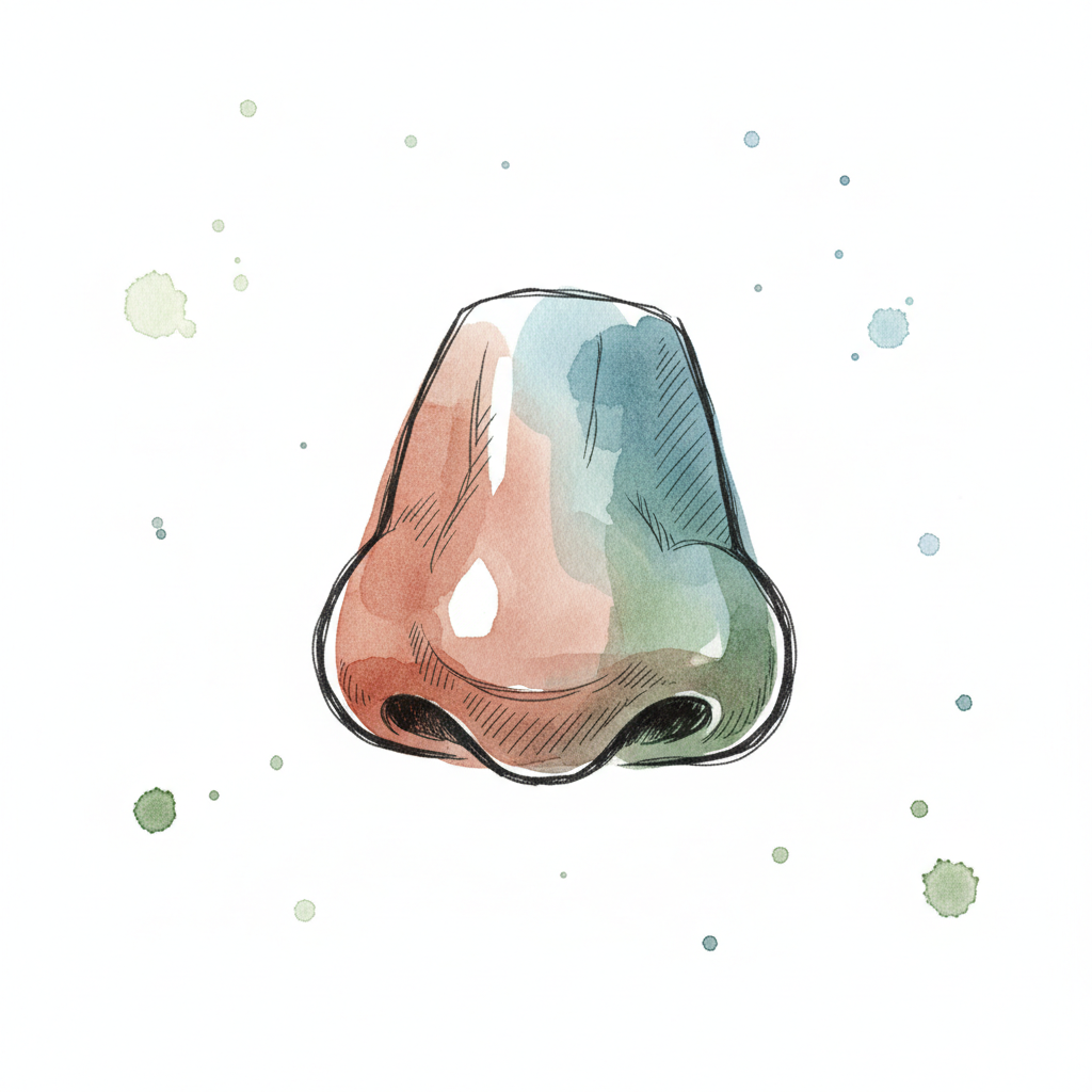 Bunte Aquarell-Illustration einer Nase mit Tuschekonturen und Farbspritzern auf weißem Grund.