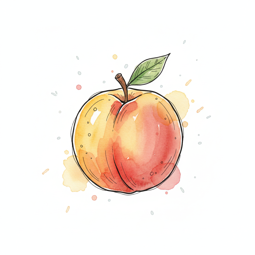 Aquarell-Illustration eines Pfirsichs mit Blatt und Farbspritzern auf weißem Hintergrund.