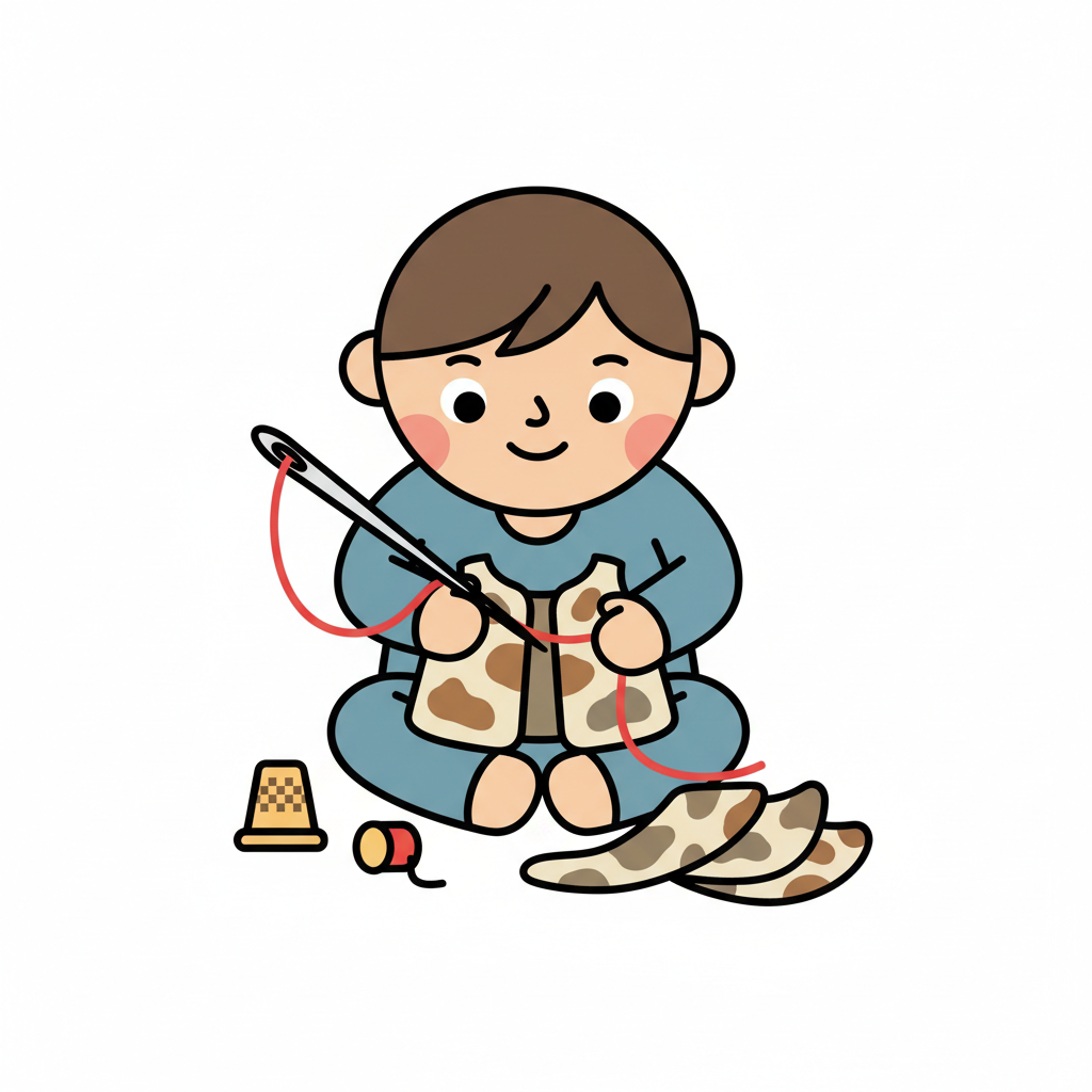 Ein lächelndes Kind sitzt und näht Stoffstücke mit Nadel und Faden. Ein Fingerhut liegt daneben.