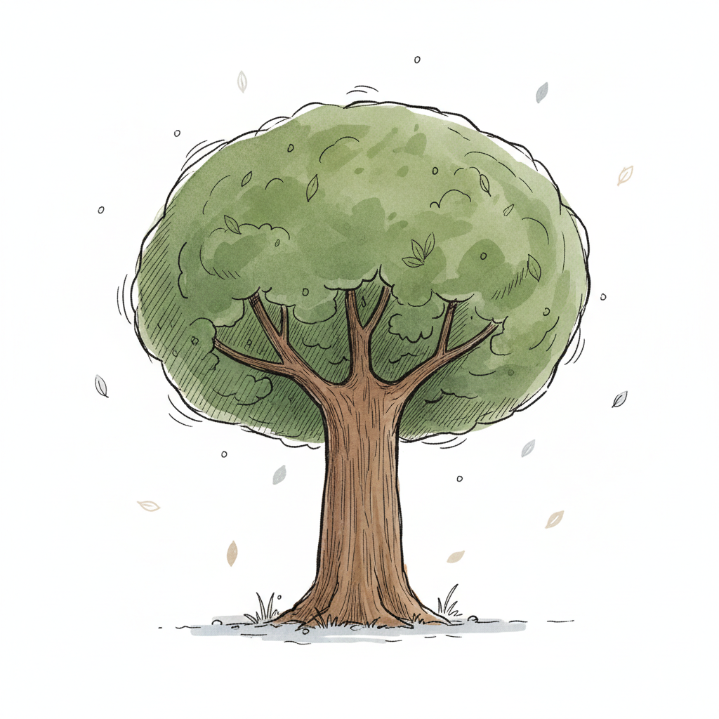 Illustration eines Baumes mit grüner Krone und braunem Stamm, Blätter fallen im Wind.