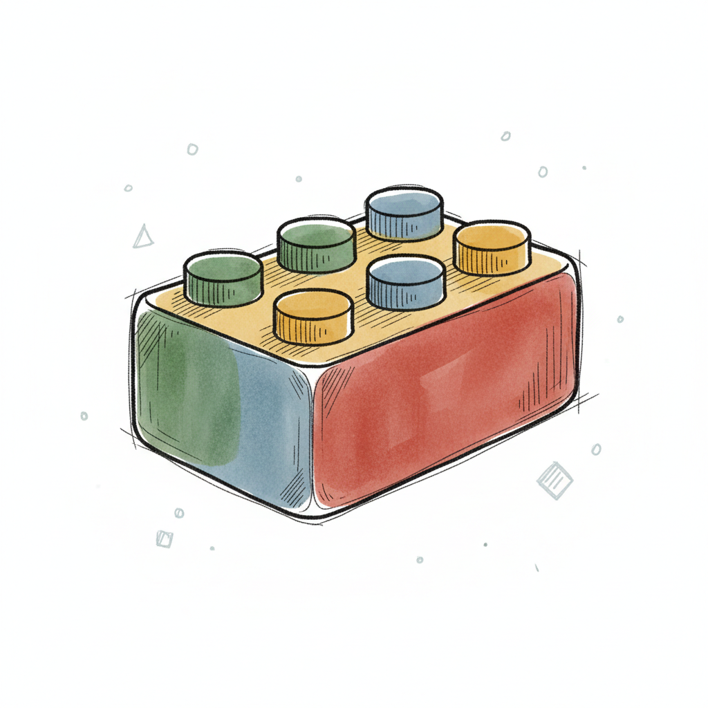 Handgezeichneter, bunter Baustein mit sechs Noppen im Aquarell-Skizzenstil.