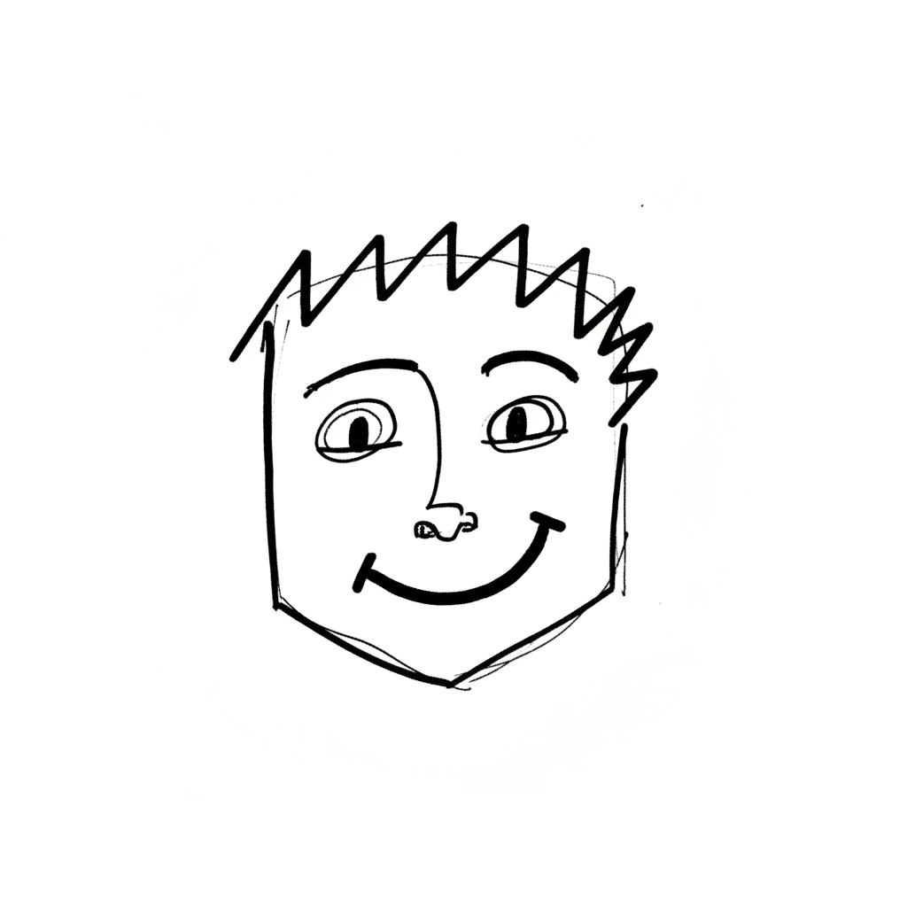 Schwarz-weiße Skizze eines lächelnden Cartoon-Gesichts mit zackigem Haar.