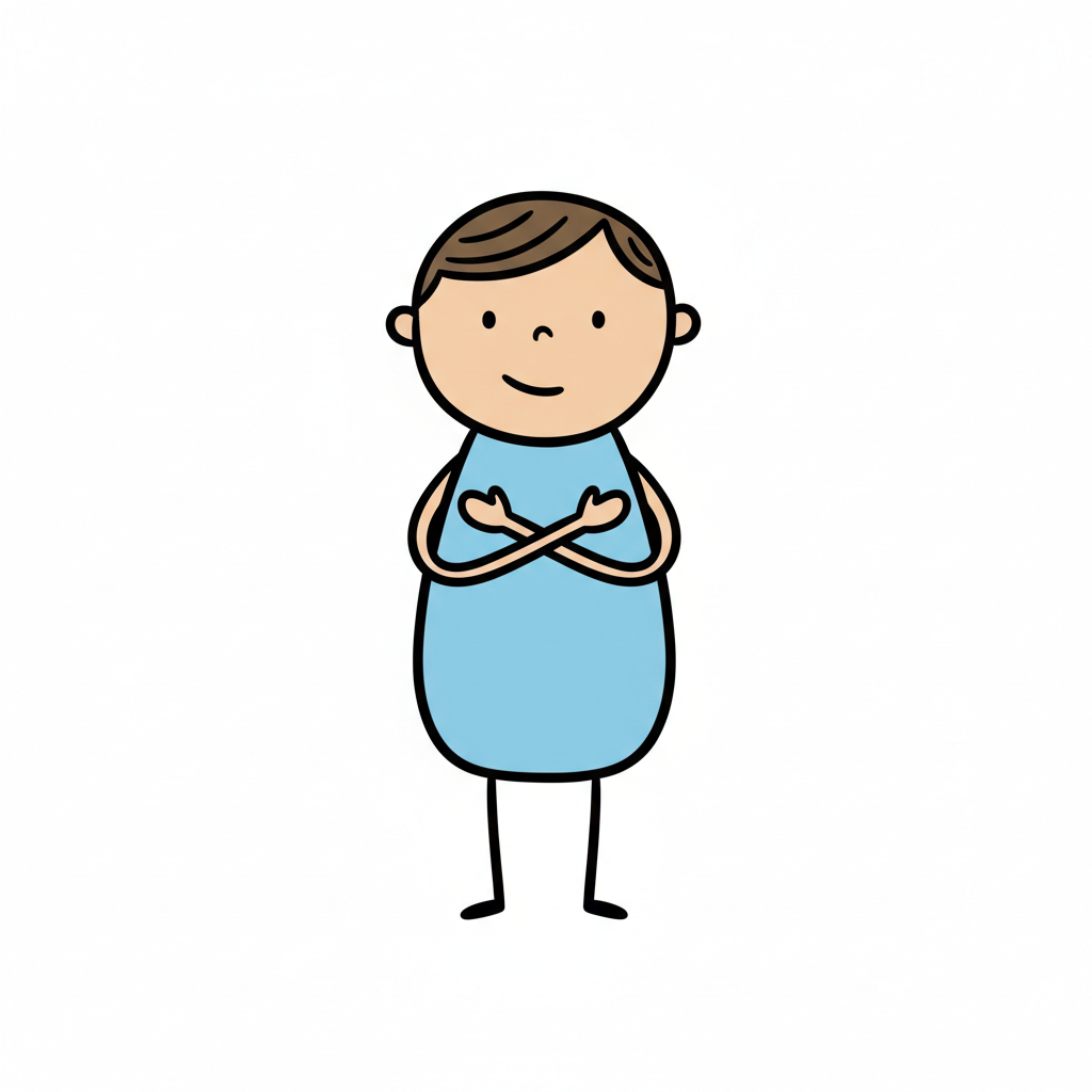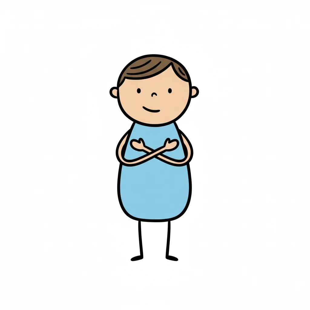 Ein Cartoon-Charakter steht mit verschränkten Armen und lächelt.