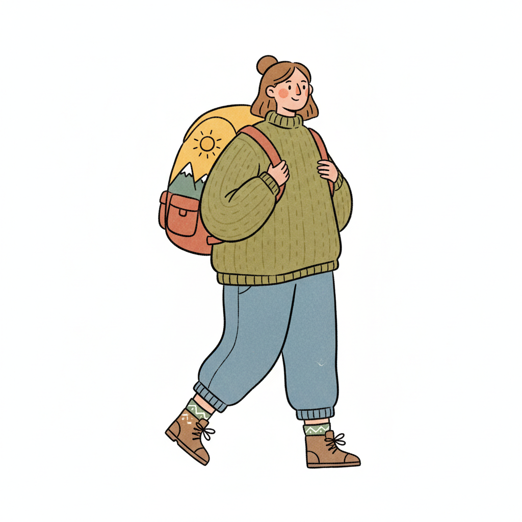Eine lächelnde Person mit Rucksack und Bergmotiv, gekleidet für eine Wanderung.