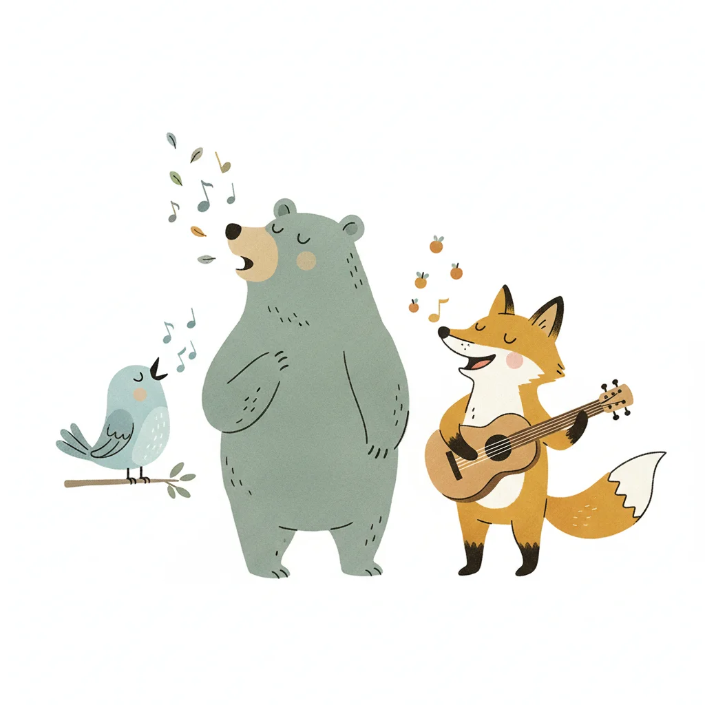 Fröhliche Tierillustration: Bär und Vogel singen, Fuchs spielt Gitarre.