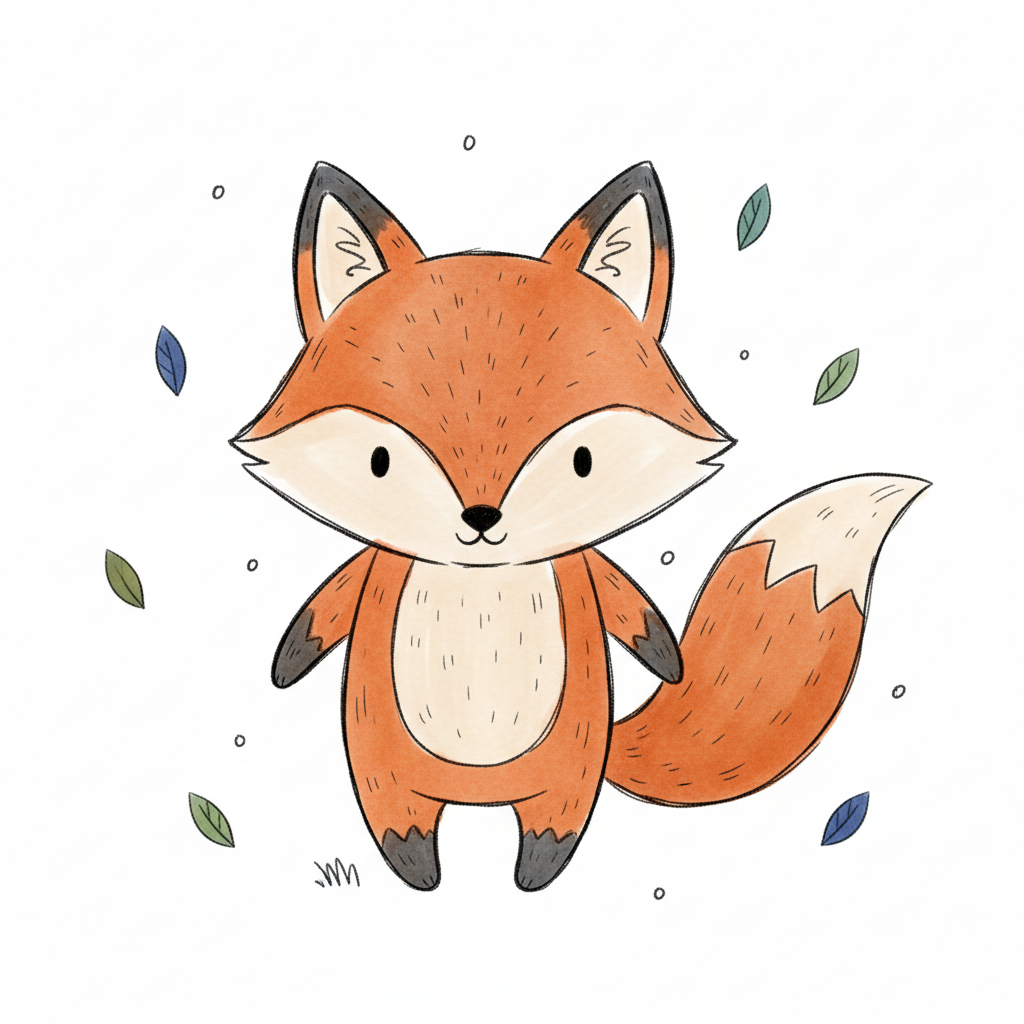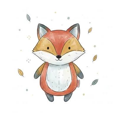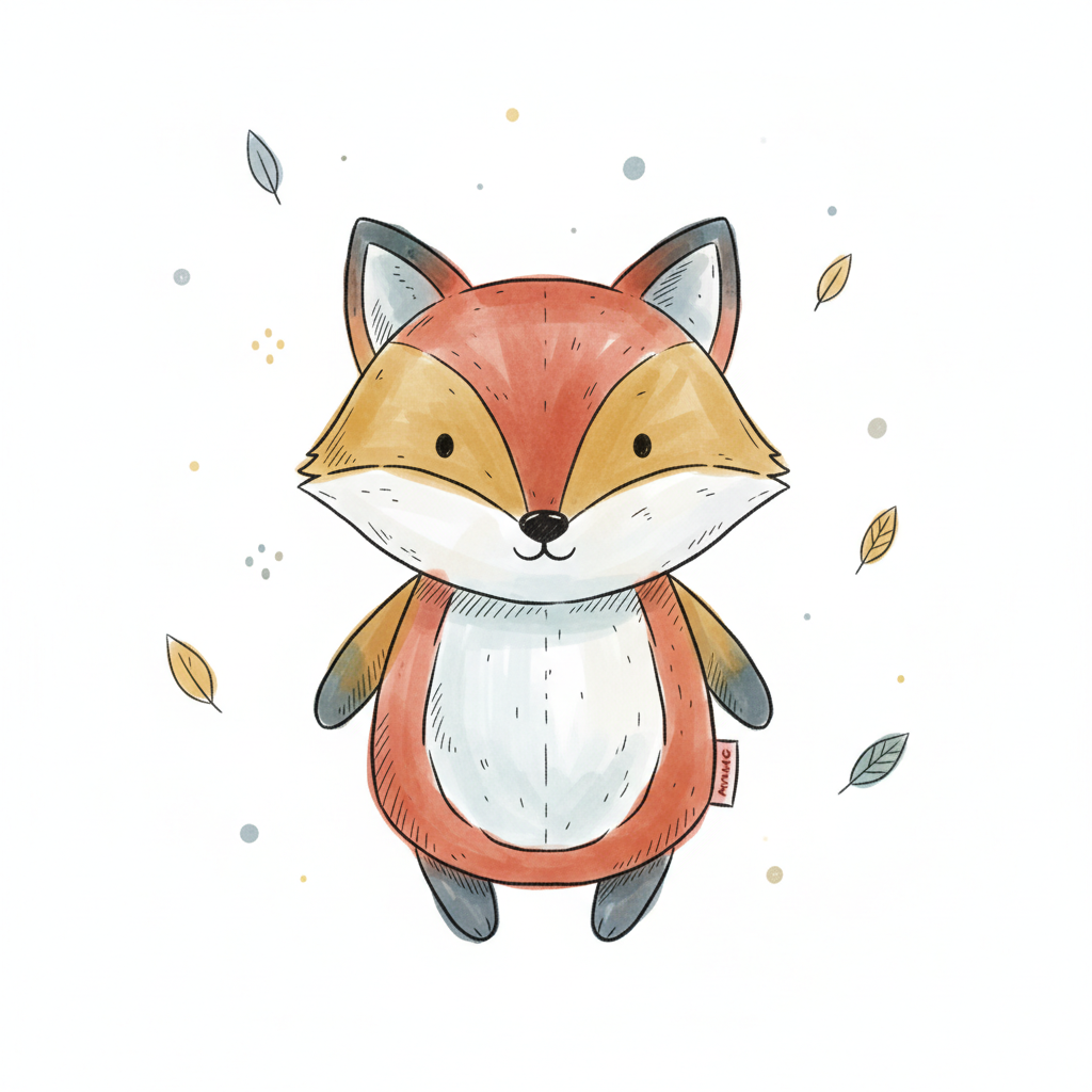 Niedlicher, gezeichneter Fuchs in Aquarell-Optik, umgeben von kleinen Blättern auf weißem Grund.