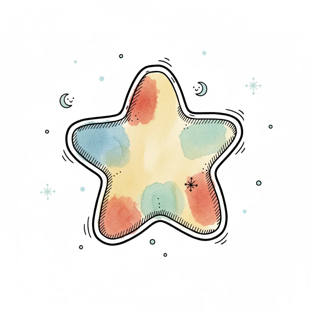 Bunte, handgezeichnete Stern-Illustration im Aquarell-Stil mit kleinen Mond- und Stern-Details.