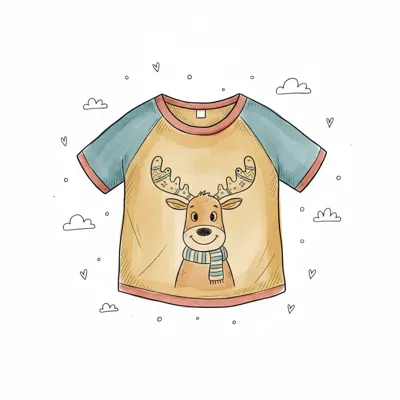 Niedliches T-Shirt mit lächelndem Rentier und Schal, umgeben von kleinen Wolken und Herzen.