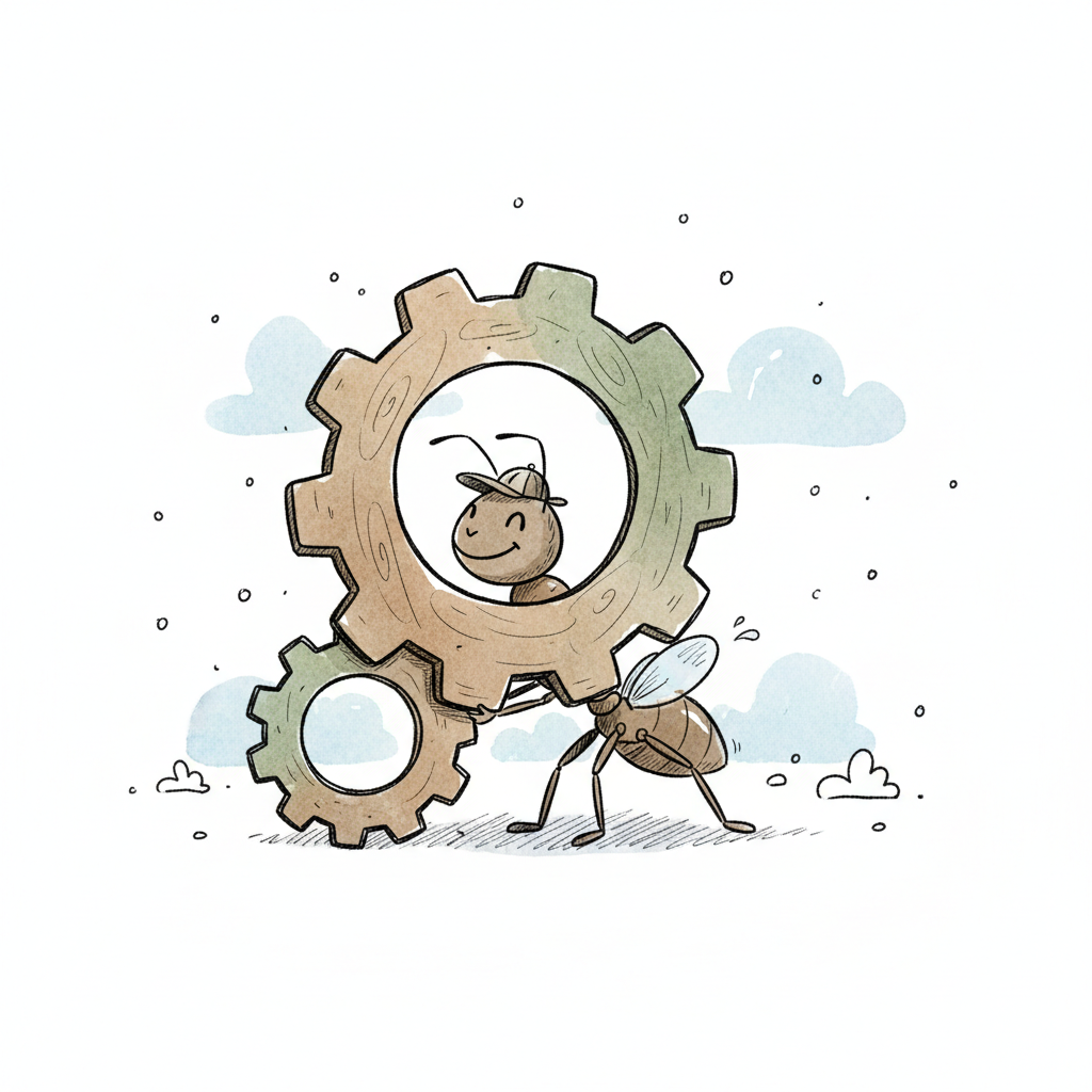 Eine Ameise trägt Zahnräder in einer cartoonhaften Landschaft.